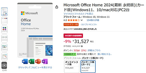 Word、Excel、PowerPoint、OneNoteの2024バージョンを、Windows・Macの2台のPCで永続的に利用可能。参考価格34,477円で、現在9%OFFの31,527円というお買い得価格で手に入ります。