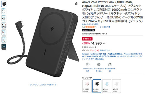 マグネット式ワイヤレス充電と30W USB-Cケーブル内蔵を両立したこのモデルが、参考価格7,990円のところ、38%OFFの4,990円という5,000円を切る破格の価格で手に入ります。