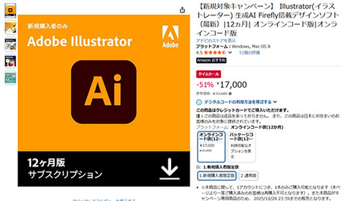 Adobeの定番デザインソフト「Illustrator(12か月版)」が、新規購入者限定でAmazonタイムセールに登場しました。