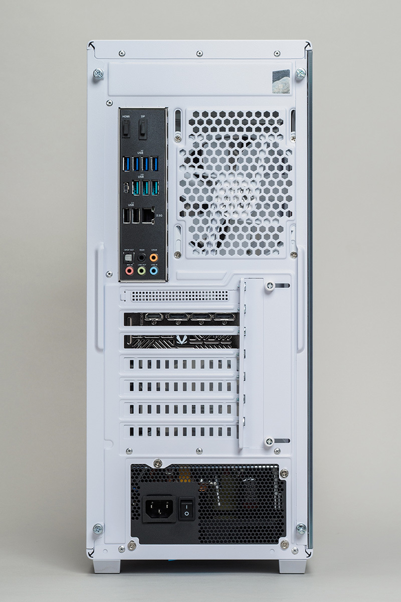 本体背面。内部パーツを冷却した空気が大型のファンで外部に排出される仕組み。評価機の場合、背面のインターフェースは、USB 3.2 Gen 2 Type-C×1、USB 3.2 Gen 2 Type-A×3、USB 3.2 Gen 1 Type-A×4、USB 2.0×2、LAN×1、マイク入力×1、ラインイン×1、ラインアウト×1、リアスピーカー×1、センター・サブウーファー×1、SPDIF/オプティカル/角形×1、HDMI×1、DisplayPort×3が搭載されていた