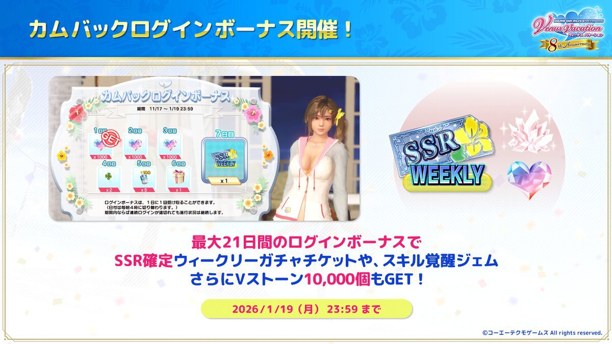 復帰オーナー限定のカムバックログインボーナスが登場。チュートリアルを終了し、90日間以上ログインしていないオーナーを対象としたログインボーナスを期間限定で開催。期間中に21日間ログインすることで「SSR確定ウィークリーガチャチケット」×1枚、「カムバックプレミアムヴィーナスギフト」×3個、無償Vストーン×1万個などの豪華アイテムを入手できる。開催期間は、2026年1月19日23時59分まで。