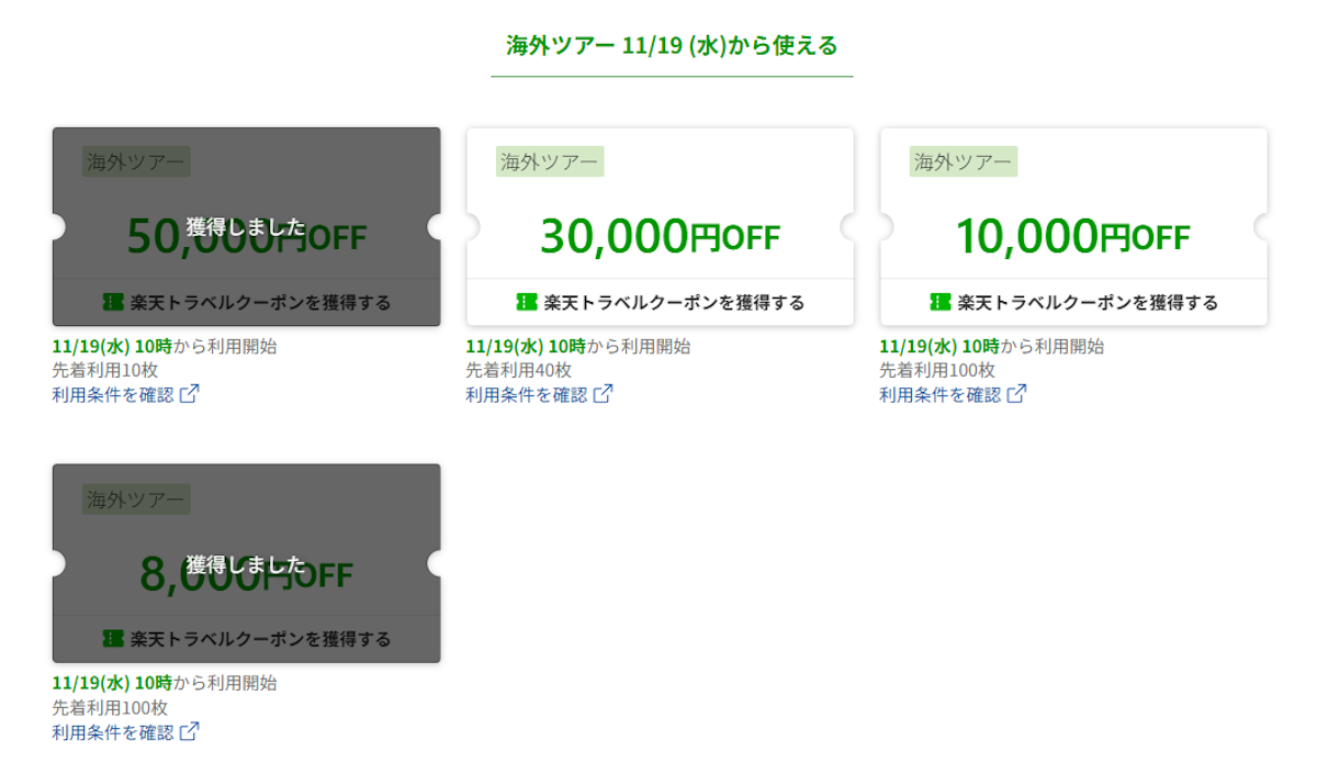 また、11月19日には海外ツアーが最大5万円オフ(金額条件:55万円以上)になるクーポンを数量限定(10枚)で配布するほか、8000円オフ(金額条件:9万円以上)のクーポンも100枚配布します。11月24日もクーポンが配布されるので要チェック。