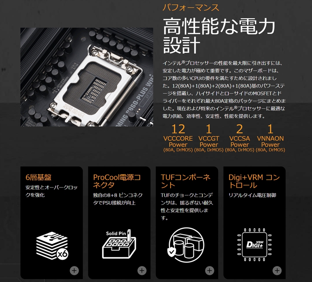 製品情報URL:https://www.asus.com/jp/motherboards-components/motherboards/tuf-gaming/tuf-gaming-b860-plus-wifi/