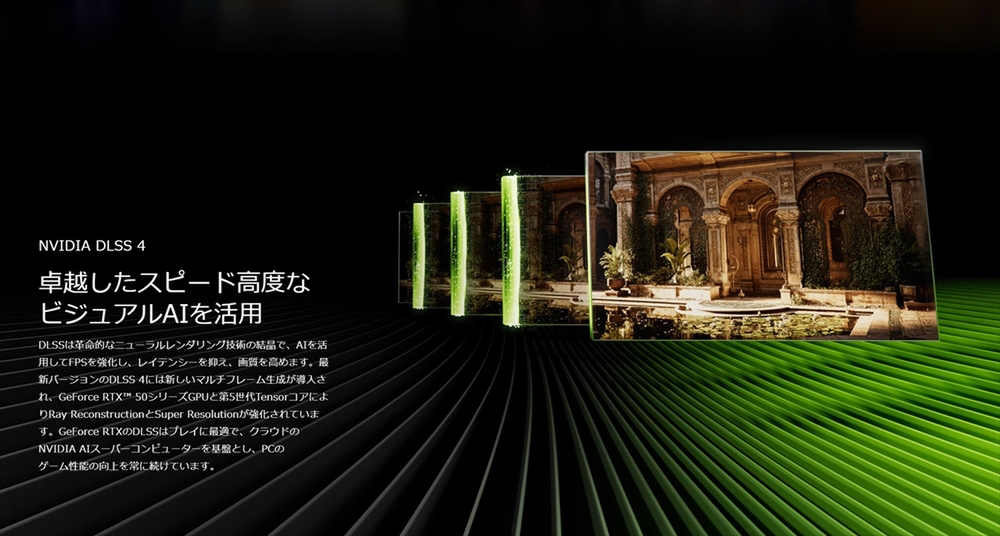 GeForce RTX 50シリーズは、DLSS 4による「マルチフレーム生成」に対応したことで、対応ゲームにおいてはネイティブのレンダリング処理と比べて最大4倍近いフレームレートを実現できるといった強みがある。
