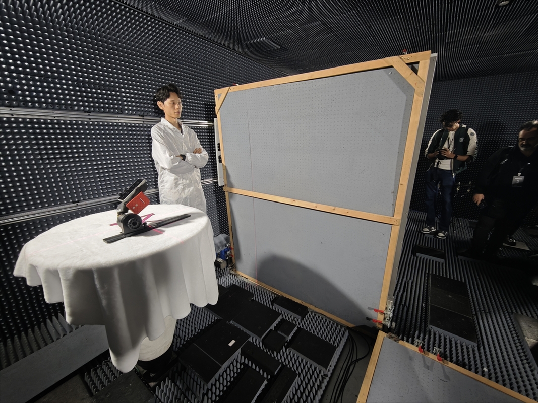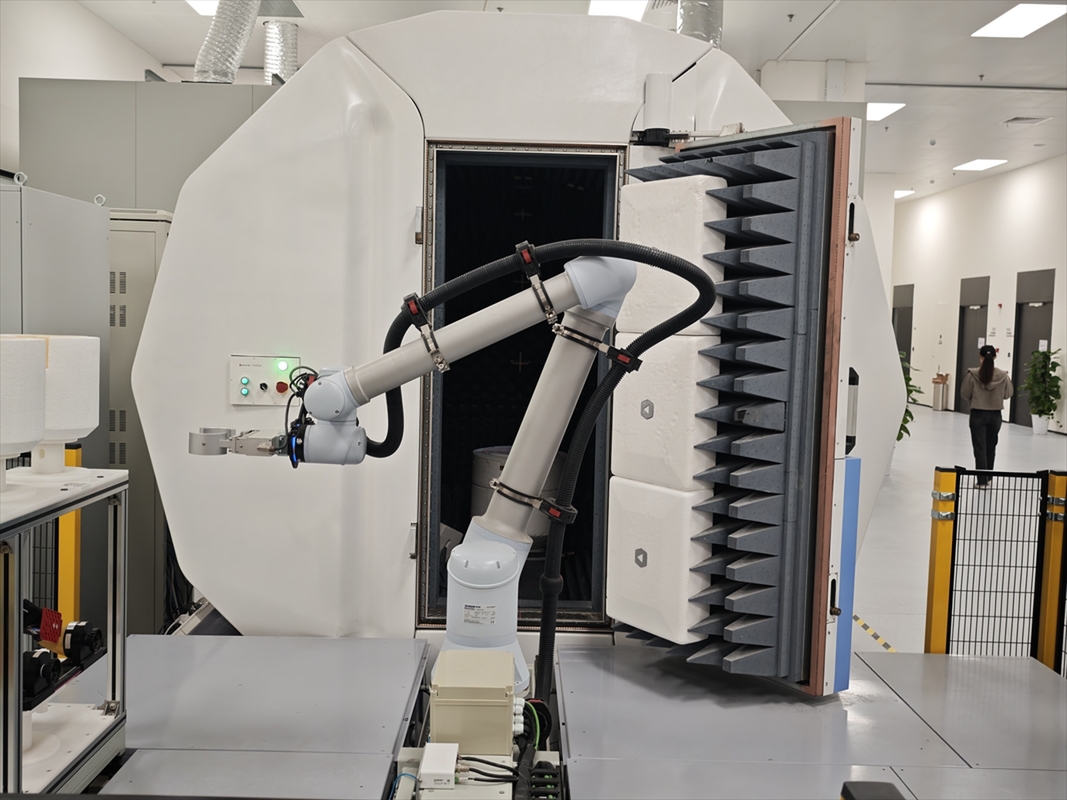 電波の送受信性能を測定する施設です。端末を回転させながら信号強度を測定し、壁面には高密度のPRF吸収材が使用されることで、正確な測定環境が保証されています。これにより、弱いネットワーク環境下でも優れたパフォーマンスを発揮できるかどうかを評価しています。