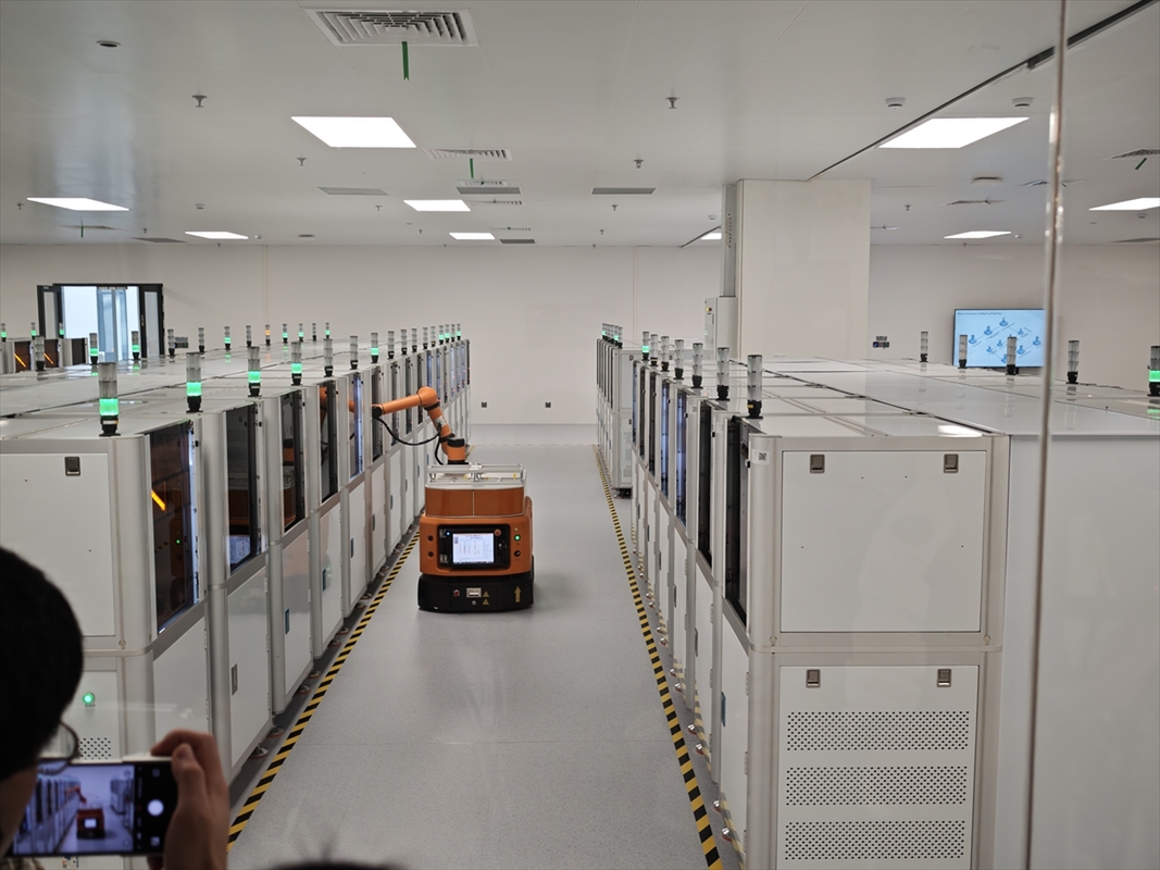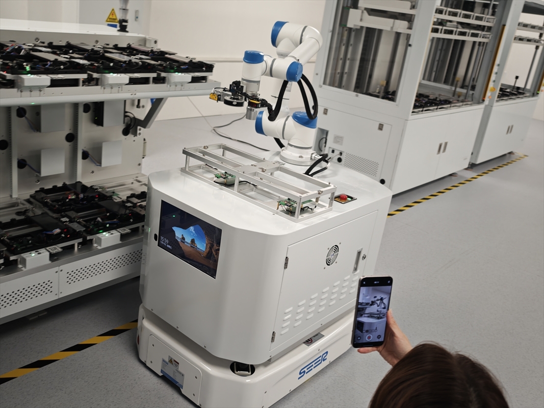 電力消費ラボでは、携帯電話の消費電力を車でいう「燃費」のように捉え、電力消費の効率を最大化し、発熱を抑えることを目標としています。このラボでも自動化が進められており、AIがタスクの割り当てとスケジューリングを自動的に行ない、AGV(無人搬送車)が携帯電話を正確なテスト設備まで運びます。