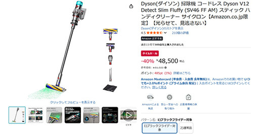 独自の光で微細なゴミを浮かび上がらせ、ピエゾセンサーがゴミの量とサイズを検知して吸引力を自動調整する、ダイソンの高機能スリムモデルです。参考価格81,500円のところ、40%オフの48,500円で手に入ります。
