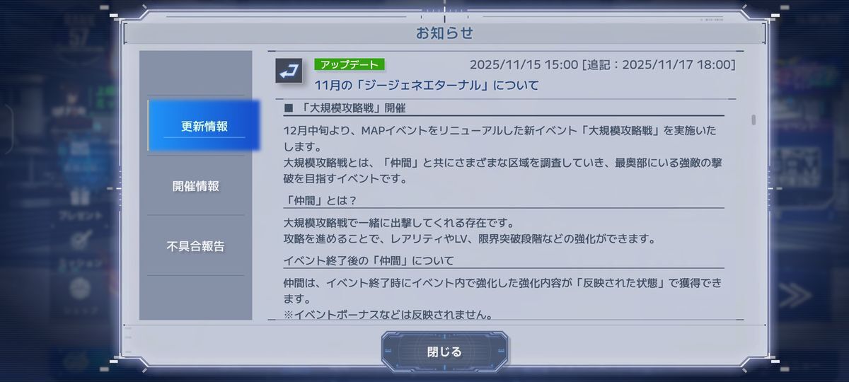 バンダイナムコエンターテインメントは11月17日、iOS/Android/PC向けガンダムシミュレーション「SDガンダム ジージェネレーション エターナル」にて、12月中旬に新イベント「大規模攻略戦」を開催すると告知した。