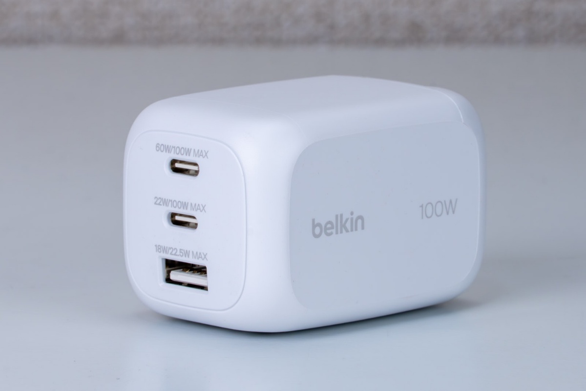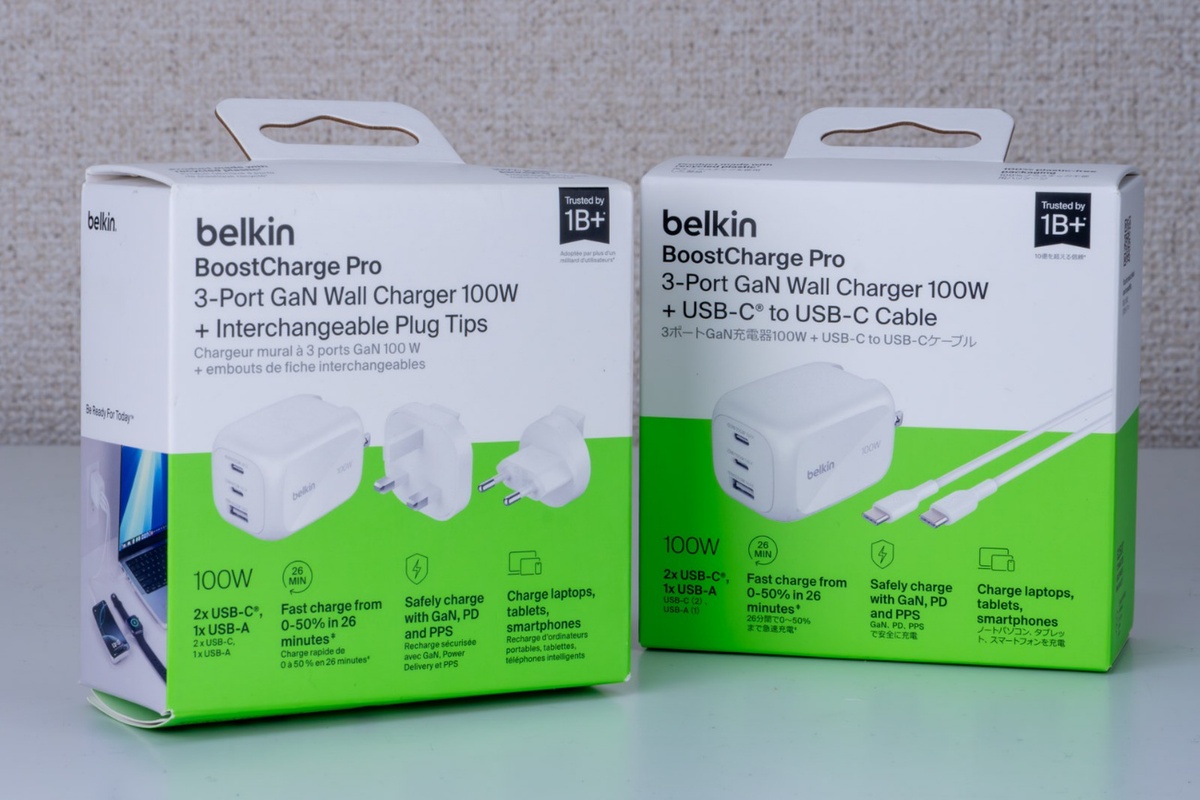 「Boost Charge Pro 3ポート GaN ウォールチャージャー 100W+トラベルアダプターキット」は、その名の通りUSB-C×2、USB-A×1の3つのポートを備えた充電アダプターだ。出力は合計100Wで、3台のデバイスを同時に充電が可能。USB-Cポートは単一で利用すれば、最大100W出力に対応する。
