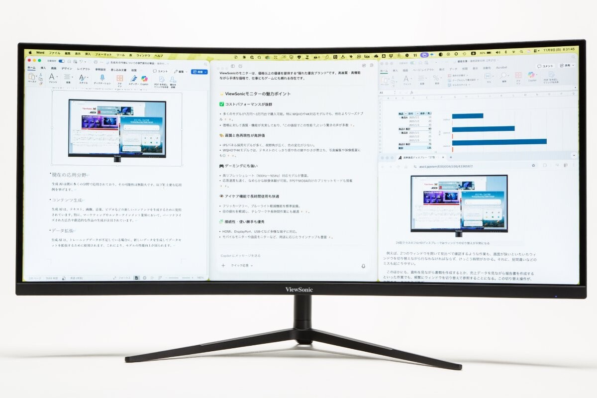 特に最近では、「ChatGPT」や「Microsoft Copilot」といった生成AIツールを業務で活用する機会も増えている。「VX3418C-2K」なら、メインの作業画面とAIツールの画面を同時に表示でき、情報を行き来しながら作業できる。ファクトチェックが必要な場面でも、複数の情報源を並べて表示できるため、正確性の確認が容易だ。