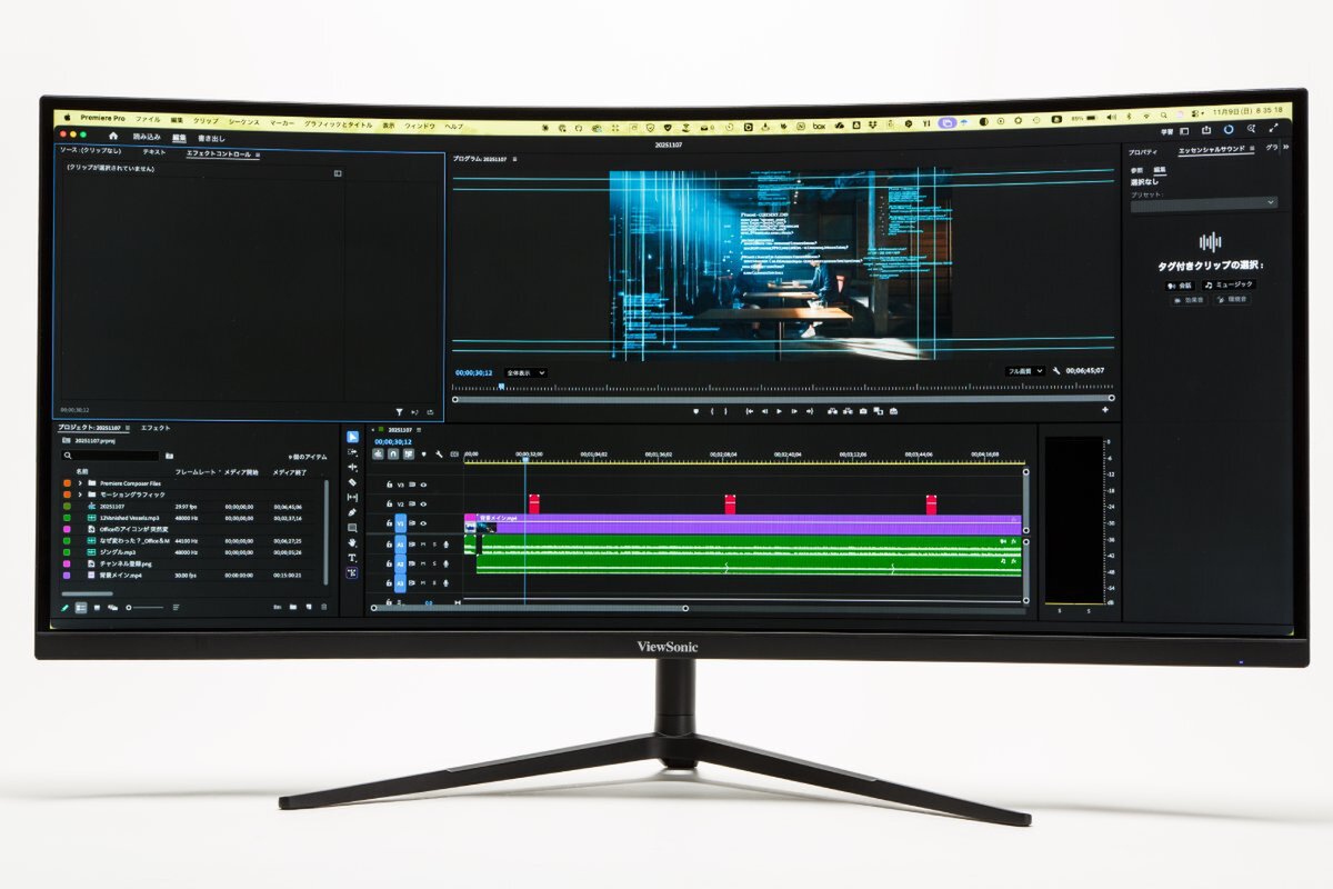 また、動画編集などクリエイティブな用途でも、「VX3418C-2K」は非常に便利。動画編集ソフトのタイムライン表示が横に長く表示されるため、編集作業中により多くのクリップを一度に確認できる。例えば、ノートPCと組み合わせた場合、ノートPCの画面で細かな情報をチェックしながら、編集作業は「VX3418C-2K」で行うといった使い方をすると、かなり効率的だ。
