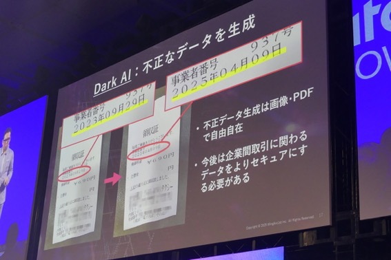 しかし、制限を持たないダークAIの場合、画像やPDFで不正データを作成できる。たとえば、経費精算で利用するレシートの日付や金額を、見た目そのままに改ざんすることが可能だ。もちろん、改ざんする方が悪いのは確かだが、改ざんできてしまうデータを生成できてしまうという点も問題になりかねない。