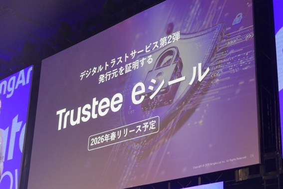 また、Trusteeの第2弾として「Trustee eシール」の提供も発表された。「社判みたいなもの」(田中氏)というeシールは発行元を証明するサービスで、2026年の春にリリース予定となる。「タイムスタンプとeシールを組み合わせることで、誰がいつ作ったものかを証明できる」と田中氏はアピールする。