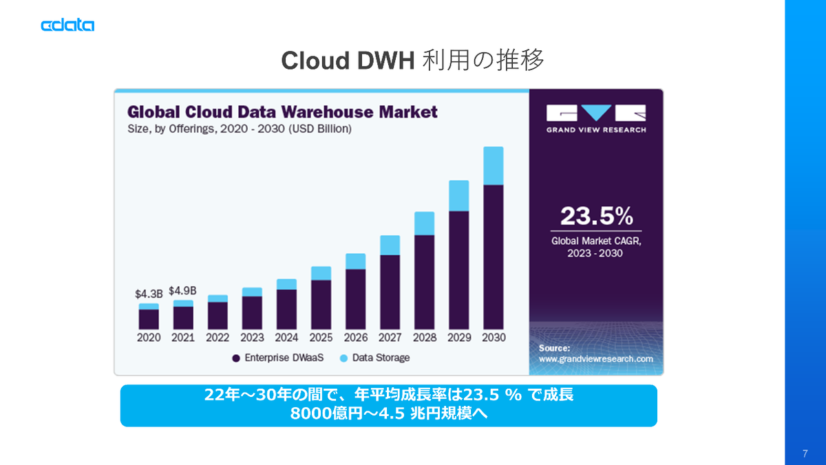 Grand View Researchの市場調査で見ても、クラウドDWHの成長率は年平均23.5%と極めて高い。Google BigQuery、Amazon Redshift、Azure Synapse Analyticsなど3大クラウドのサービスはもとより、SnowflakeやDatabricks、Treasure Dataなどサードパーティ製品もあわせて成長し、市場を拡大しているのが注目ポイント。現在、8000億円規模の市場だが、2030年には4.5兆円規模に膨らんでいくという。