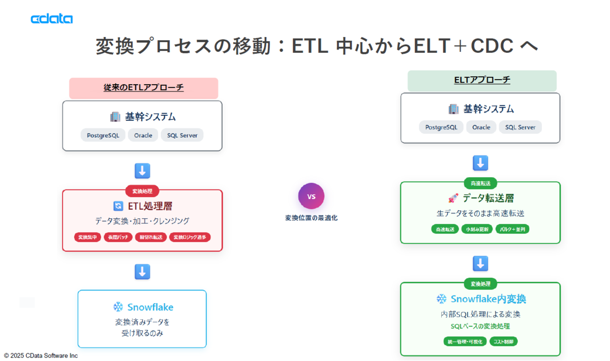 一方で、CData Syncが提唱するELT+CDCの方式は、生データや前処理済みデータをクラウドDWHに転送し、クラウドDWH上でSQLによる変換処理を行なうという方法だ。加えてデータソース側の変更を検知し、ニアリアルタイムに転送するCDC(Change Data Capture:変更データキャプチャ)で遅延を最低限に抑える(関連ページ:。「大量のデータを全件SQLで取得するのはもはや無理があります。差分だけを取得し、残りをトランザクションログから取得する方法に変えていく必要があります」と宮本氏は指摘する。
