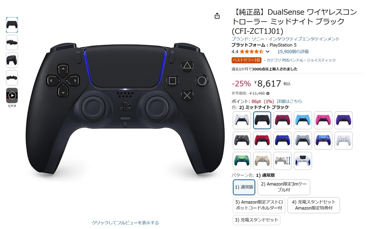 現在Amazonでは「DualSense ワイヤレスコントローラー」を最大25%オフで提供中。通常1万1480円する製品が8617円になるなど、お買い得感の強いセールとなっている。