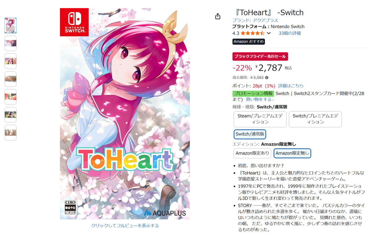 2025年11月21日から開催中の「Amazonブラックフライデー先行セール」。ここでは、アクアプラスより発売中のNintendo Switch用恋愛アドベンチャーゲーム「ToHeart(トゥハート)」がお買い得だったので紹介していこう。