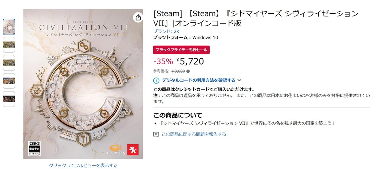 2025年11月21日から開催中の「Amazonブラックフライデー先行セール」。ここでは、Firaxis Gamesが開発し、2Kより販売中のPC(Steam)向けソフト「シドマイヤーズ シヴィライゼーション VII」が安かったので紹介していこう。
