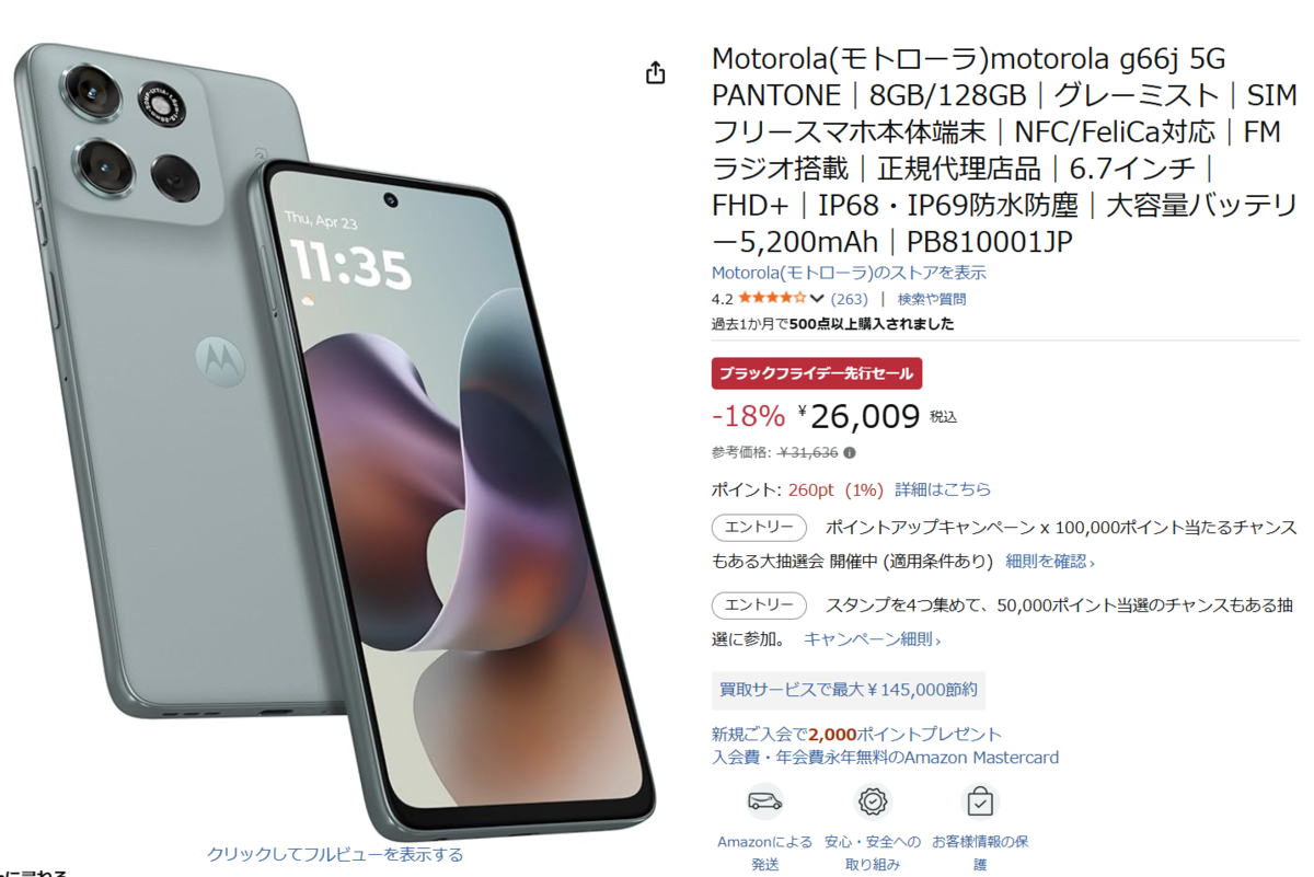 【Amazonブラックフライデー先行セール】Motorola(モトローラ)motorola g66j 5G PANTONE 8GB/128GB 登場!