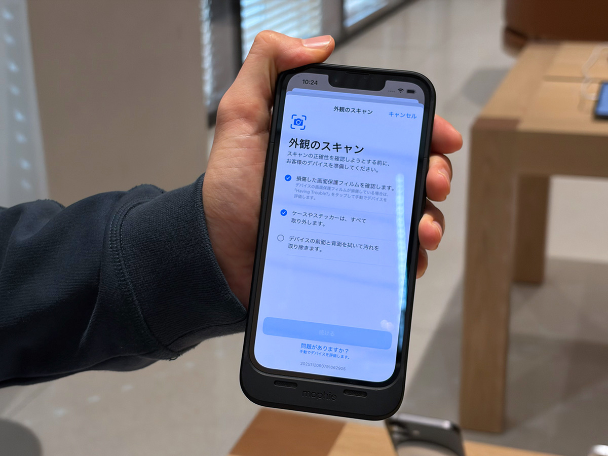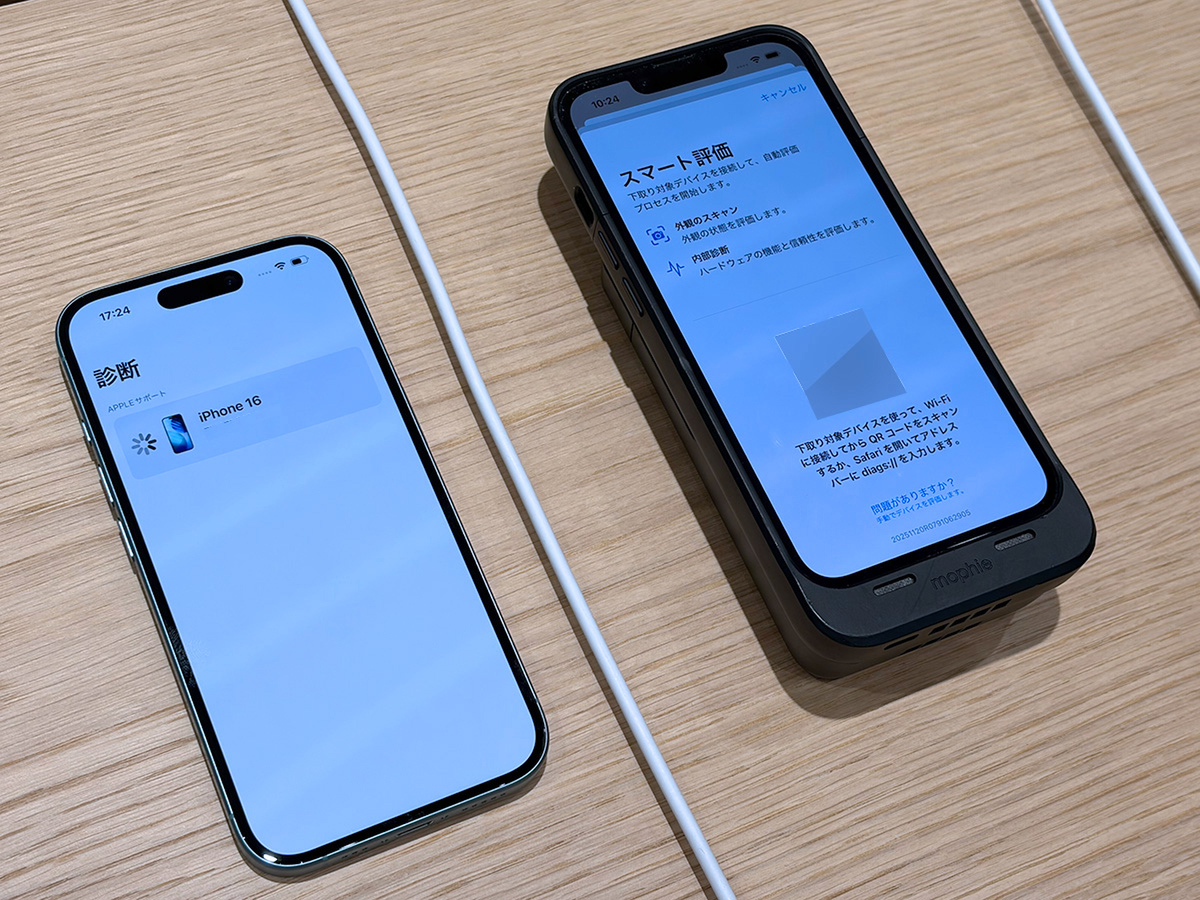 iPhoneについては、専用端末のカメラで前面・背面の画像をスキャニングして外観の状態を査定したあと、ハードウェアの機能と信頼性など内側の状態をチェックします。これらの手順はすべてストアのスタッフがナビゲートしてくれるので、デバイスを持ち込んだユーザーは煩わされる心配もありません。