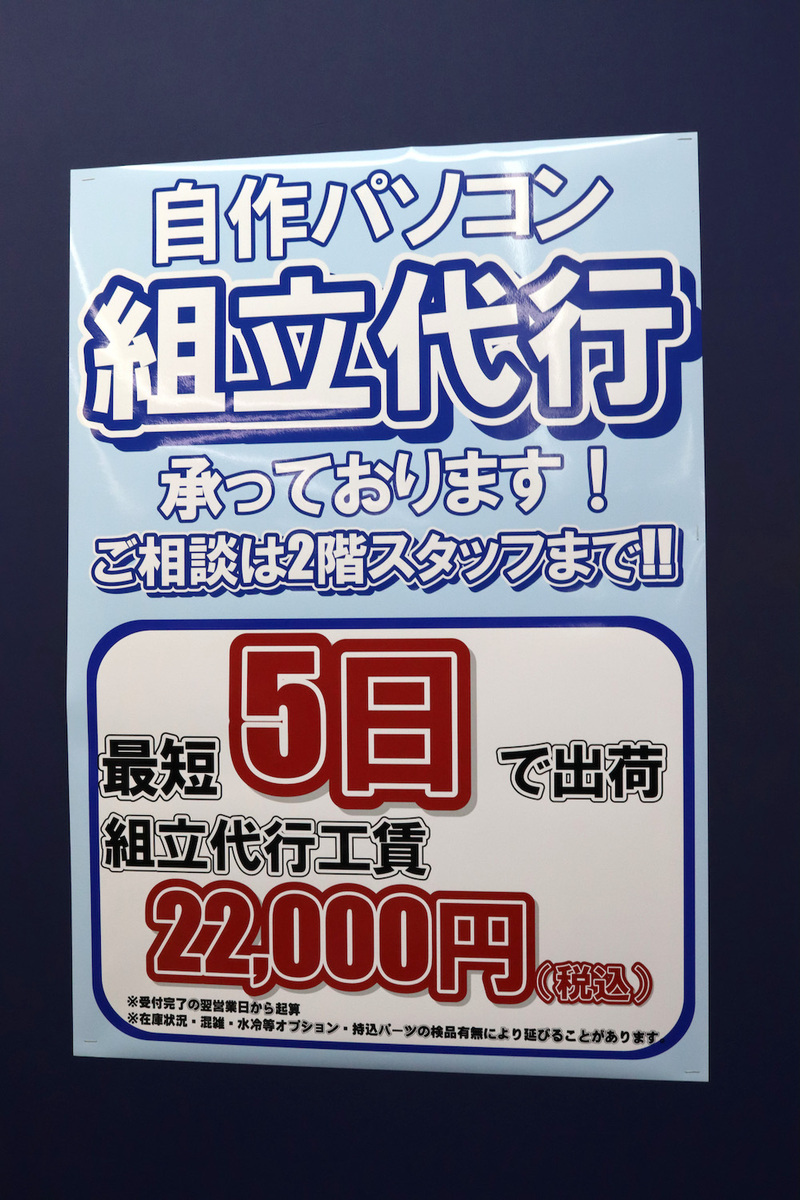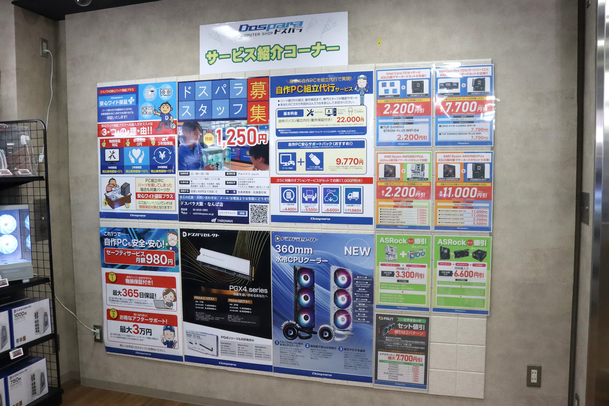 また、エスカレーターで2階に上ってスグの壁には、実施中のサービスや値引きポップが掲示されていて、一目で全て確認できるようになっています。日々進化を続けるドスパラ大阪・なんば店に足を運んでみてください!