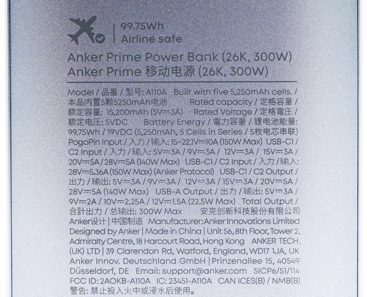 今回、モバイルバッテリーは20100mAh, 220Wと、26250mAh, 300Wの2機種が発売となった。今回は大容量の26250mAh, 300Wを使ってみた。