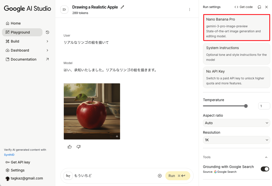 前述の通りGeminiの通常UIでは、AI Pro 2TB以上のユーザーはNano Banana Proをほぼそのまま使える。ただしモデル名は明示されず、負荷状況によって旧モデルにフォールバックする場合もある。品質を安定させたい、あるいは特定のモデルを確実に選びたい場合は、Google AI Studioで明示的にモデルを指定するとよい。ただしAI StudioでNano Banana Proを利用するには、課金対応(=有料)のAPIキーが必須となる点に注意してほしい(旧モデルは無料で利用可能)。