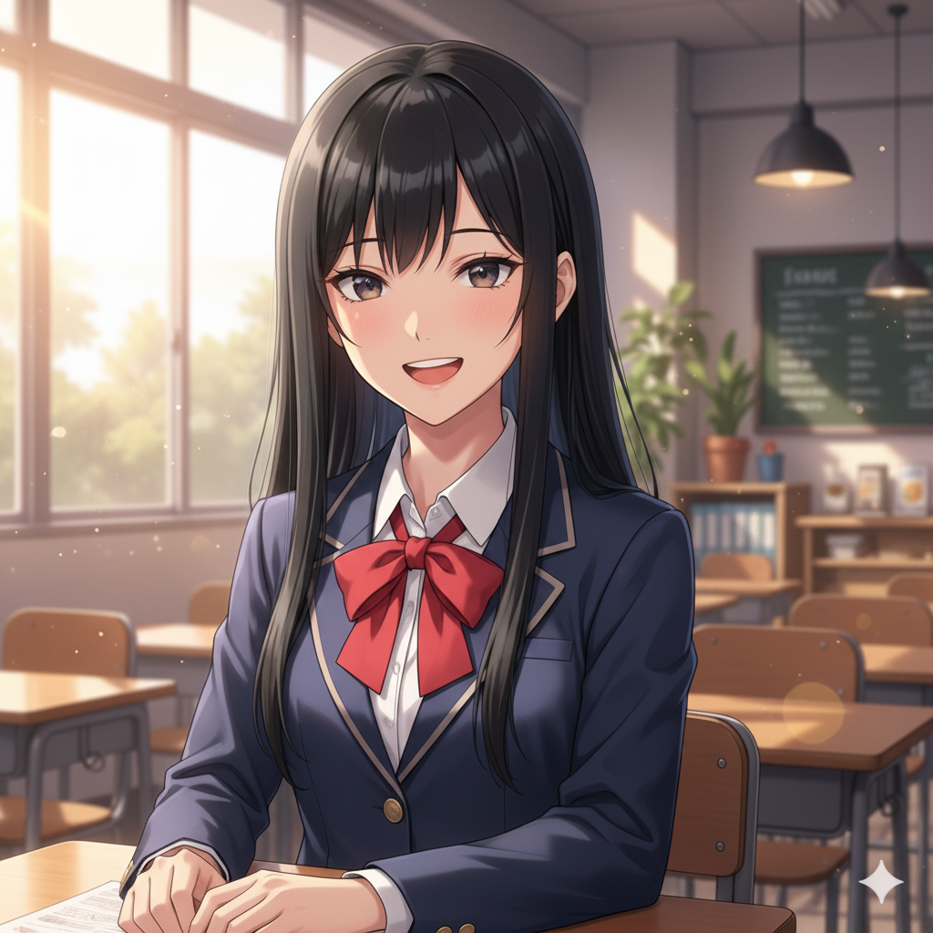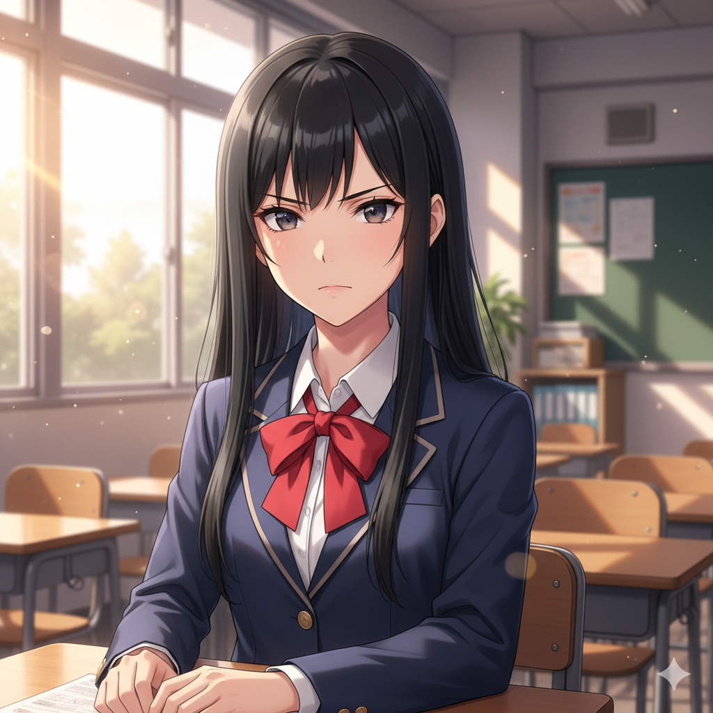 アニメスタイル、教室の机に座っている美少女。黒髪のロングストレート、意志の強い瞳、口を真一文字に結んだ真剣な表情でこちらを見つめている。ブレザーの制服、赤いリボン。午後の日差しが差し込む教室、高品質なイラスト