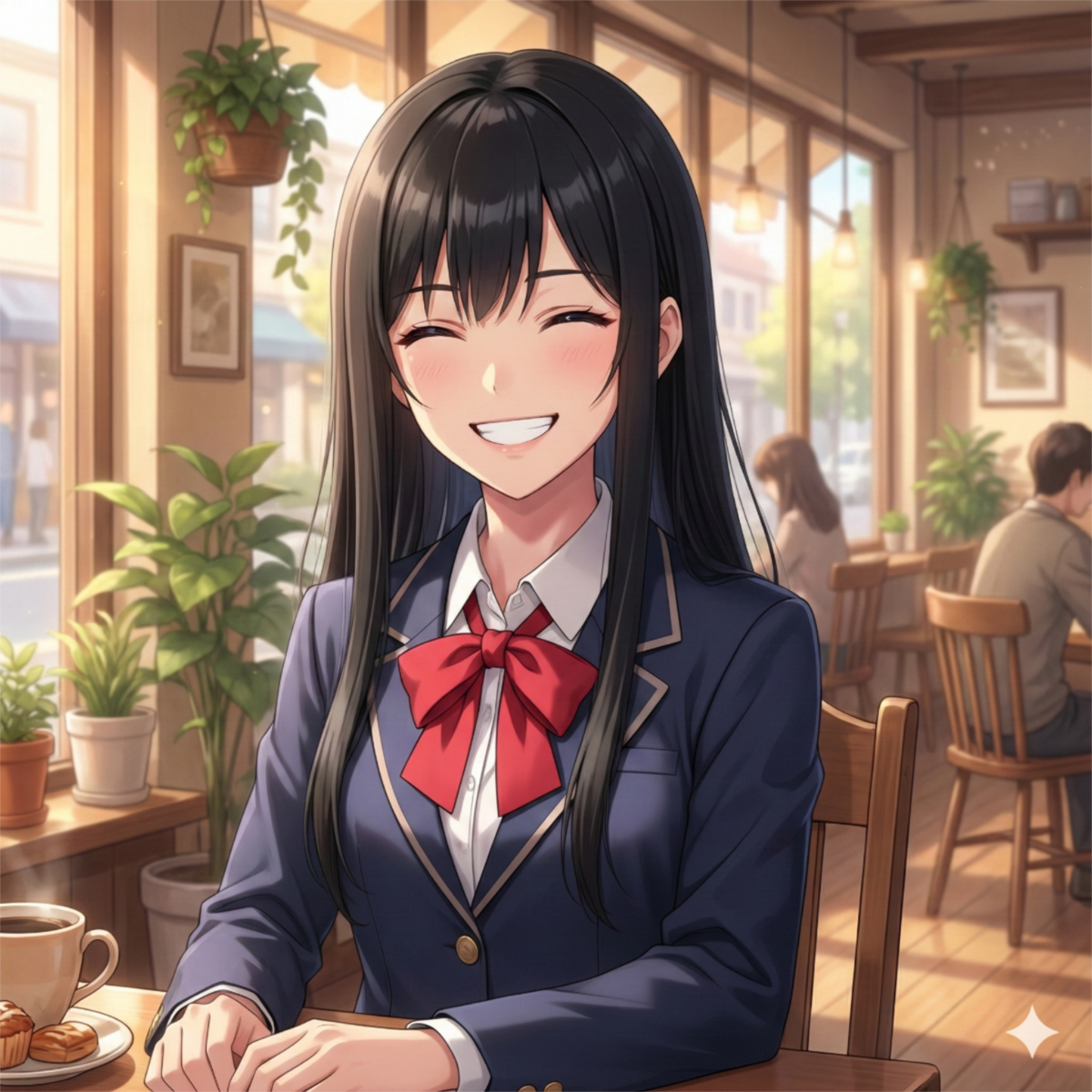 プロンプト:この画像の顔立ちを完全に維持したまま、背景をカフェに変え、満面の笑みにして