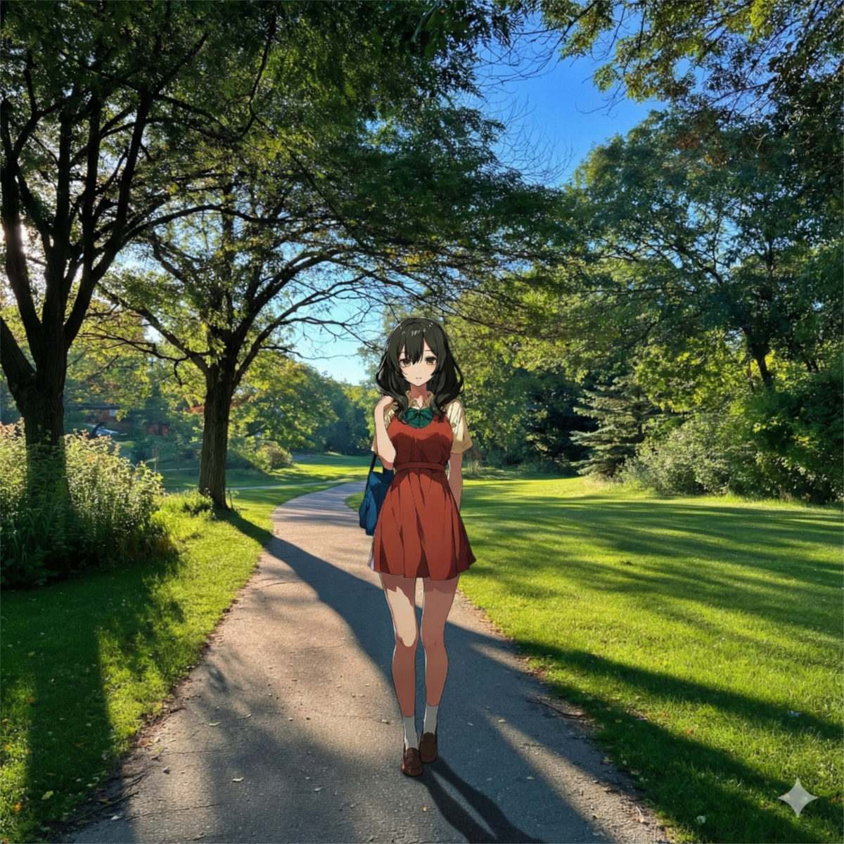では同じ作業をNano Banana Proでもやってみよう。キャラの維持、表情の変更、そして背景の変更までばっちりこなしてくれた。