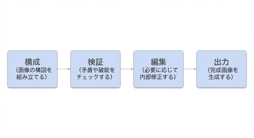Nano Banana Proでは、画像生成の内部処理が「一発生成」ではなく、構成→検証→編集→出力という段階的なステップで進むようになった。構図の整合性や物理的な矛盾をあらかじめチェックし、必要に応じて内部で手直ししてから最終画像を出すため、破綻が大幅に減っている。とくに人物の手・輪郭・物体の関係性など、従来モデルが苦手とした部分で安定度が高まっている。