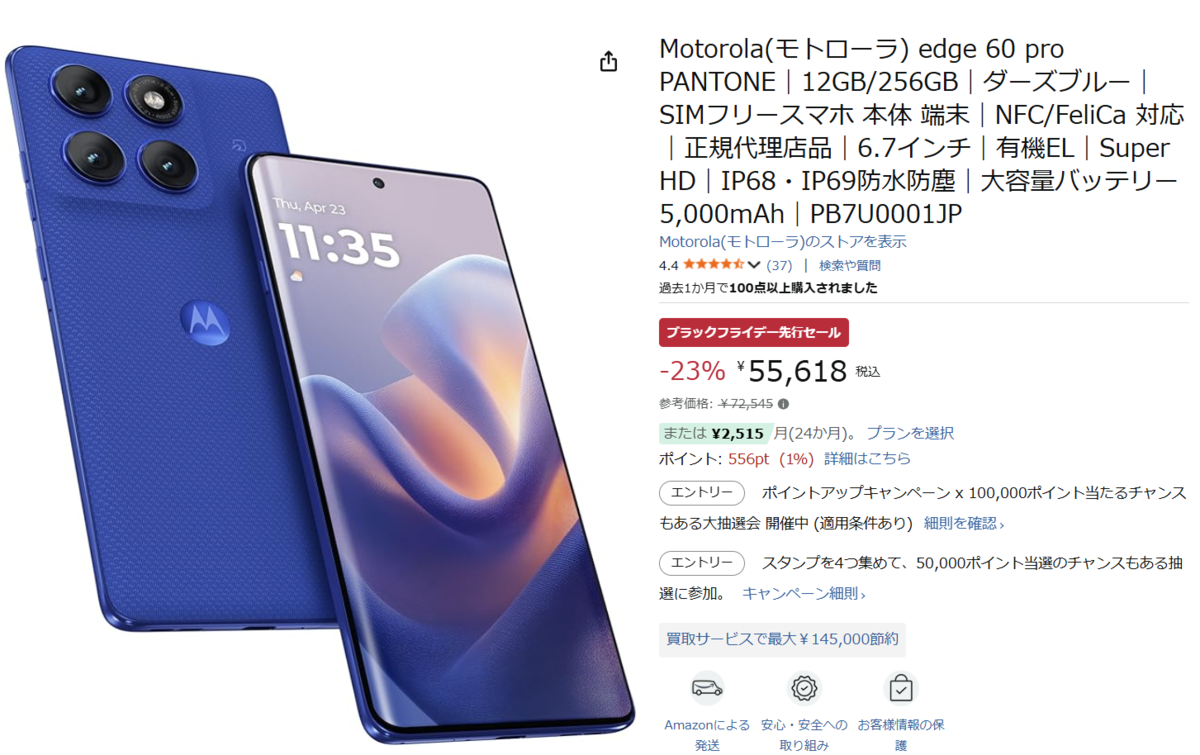 【Amazonブラックフライデー先行セール】Motorola(モトローラ)edge 60 pro PANTONE 12GB/256GB登場!