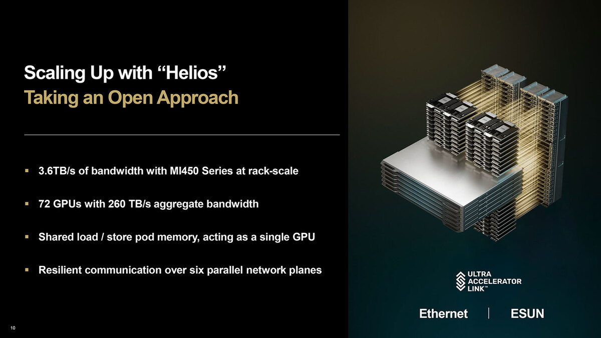 実は、Instinct MI450の世代ではHeliosというラックが提供されることがすでに公開されている。このHeliosの中身が下の画像で示されている。