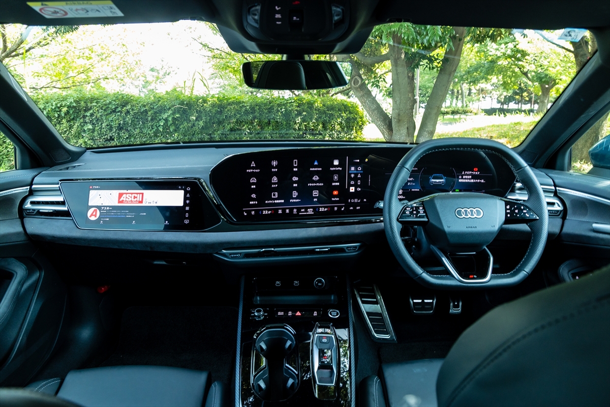 運転席は今までのアウディとは一線を画すもの。センターディスプレイと一体化したカーブドディスプレイは、運転席側が11.8インチ、センター側が14.5インチと大画面。そして、ハンドルの上下が少し直線形状の近未来デザインになっていました。