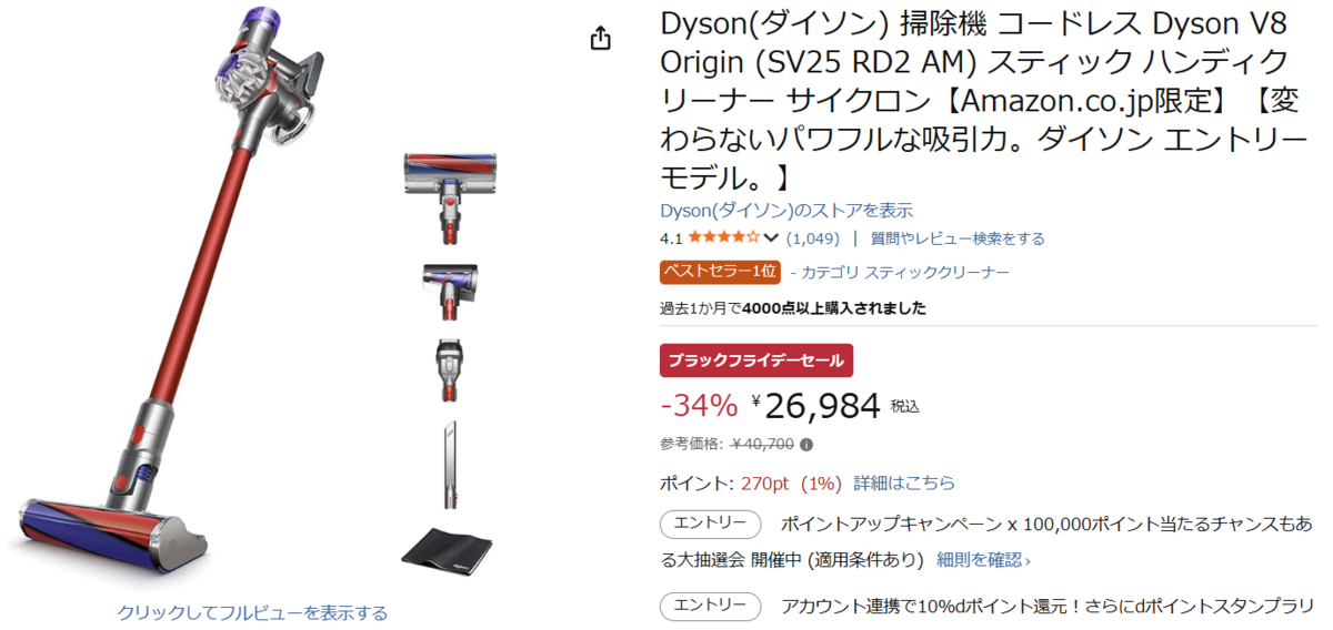 大人気モデルがお得に! Dyson(ダイソン)のコードレス掃除機「Dyson V8 Origin(SV25 RD2 AM)」のAmazon.co.jp限定モデルが、Amazonブラックフライデーセールに登場しました。