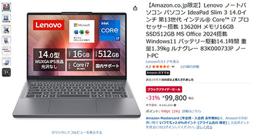 LenovoのノートPC「IdeaPad Slim 3」(Core i7-13620H/Office Home & Business 2024搭載)が、Amazonブラックフライデーセールに登場しました。