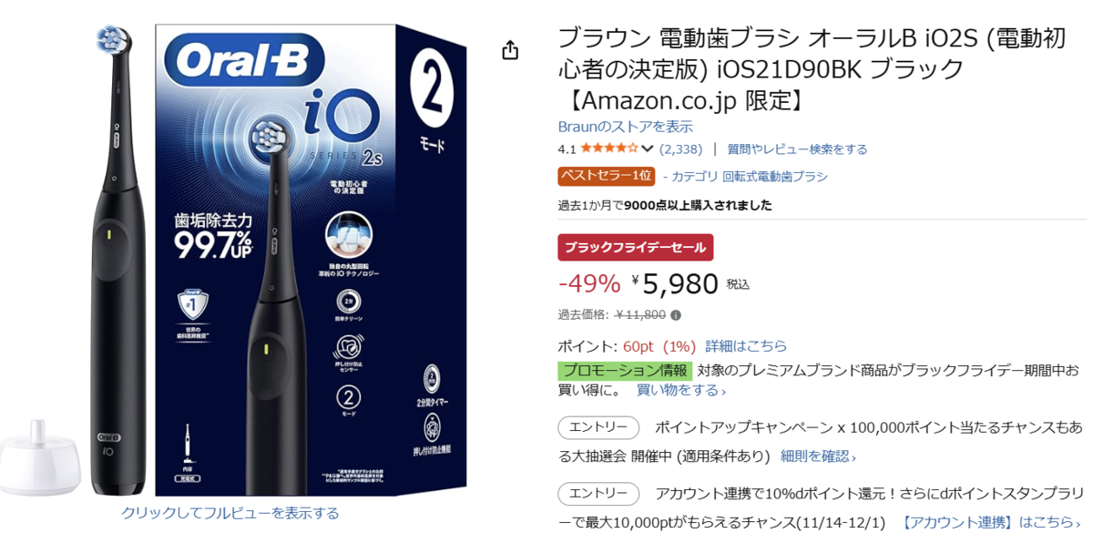 【Amazonブラックフライデーセール】ブラウン 電動歯ブラシ オーラルB iO2S が登場!