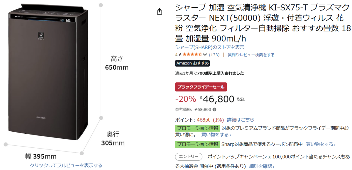 【Amazonブラックフライデー】シャープ 加湿 空気清浄機 KI-SX75-T登場!