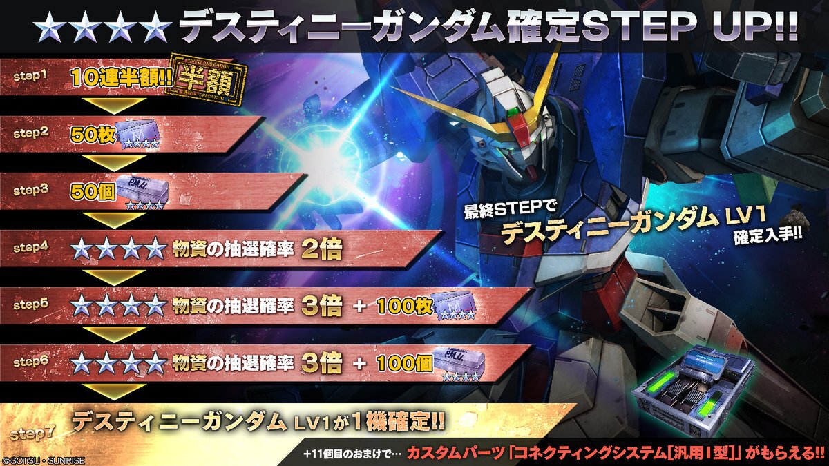 「デスティニーガンダム確定STEP UP抽選配給」ではSTEP7で「デスティニーガンダムLV1」が一機確定で入手可能、デスティニーガンダム向けの「カスタムパーツ確定STEP UP抽選配給」ではデスティニーガンダムとの相性を考慮したカスタムパーツが入手可能となっているので、「デスティニーガンダム」が実装するこの機会に、ぜひあわせてチェックしてみよう。