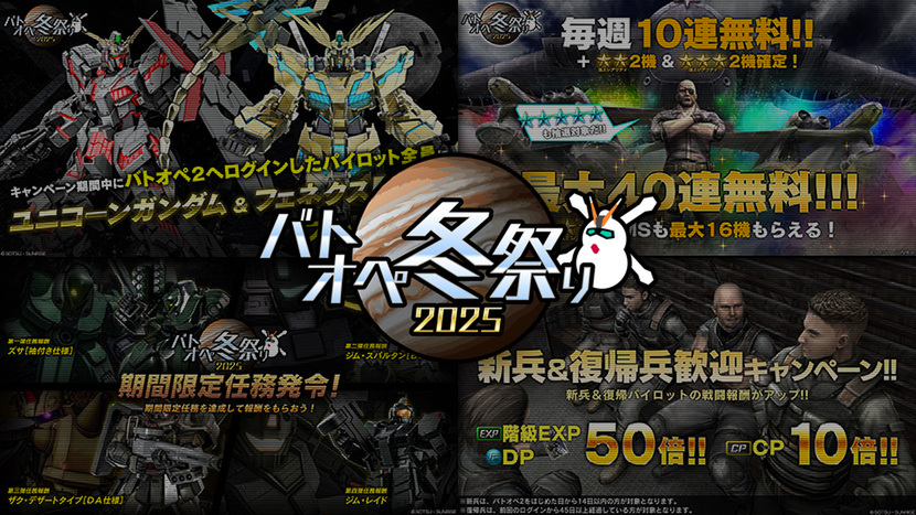 2025年12月4日14時のアップデートより、「バトオペ冬祭り2025」を開催。期間中はログインボーナスとして「ユニコーンガンダムLV1」「フェネクス【NT】LV1」を配布するほか、★2以上のMS2機と★3以上のMS2機が確定で手に入る毎週10連無料抽選配給を実施する。上記キャンペーンを含め、「バトオペ冬祭り2025」のキャンペーン内容に関する詳細は、追って公式サイトや公式Xにて順次公開予定となるので、楽しみ待とう。