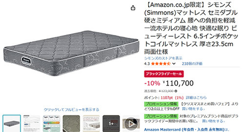 世界の高級ホテルで採用されるシモンズのマットレス「ビューティーレスト 6.5インチポケットコイルマットレス」が、Amazonブラックフライデーセールに登場しました。