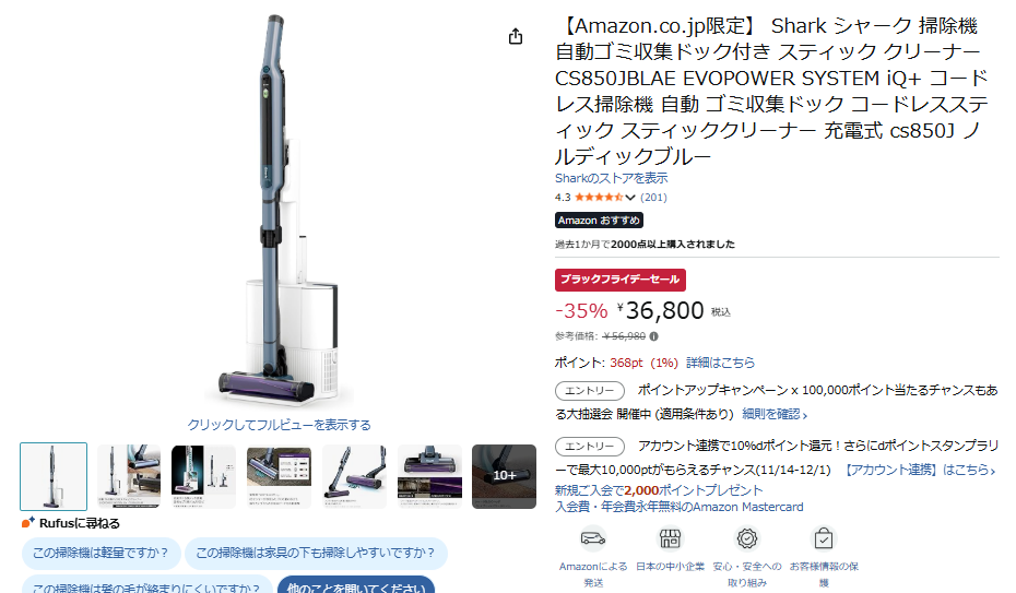 AmazonブラックフライデーセールでシャークのEVOPOWER SYSTEM iQ+が35%OFFの36,800円で手に入ります。