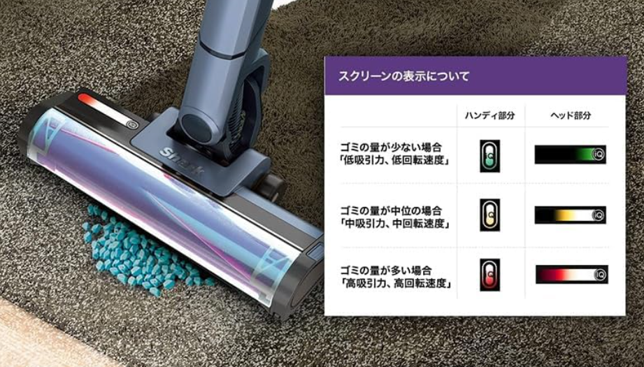 また、床の状態に応じてiQモニターが緑・黄・赤に変化するため、見えないホコリも見逃さず、キレイになったのが一目でわかります。