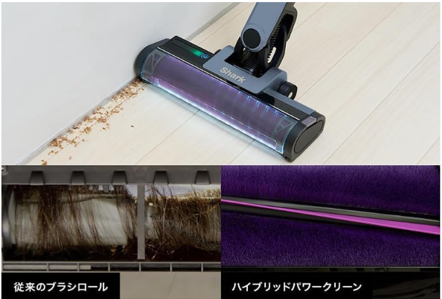 シャーク独自の「ハイブリッドパワークリーンヘッド」は床に密着し、大きなゴミから細かいホコリまでしっかり吸引。