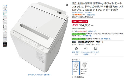 【Amazonブラックフライデーセール】日立 全自動洗濯機 洗濯10kg ホワイト ビートウォッシュ BW-V100MR W登場!