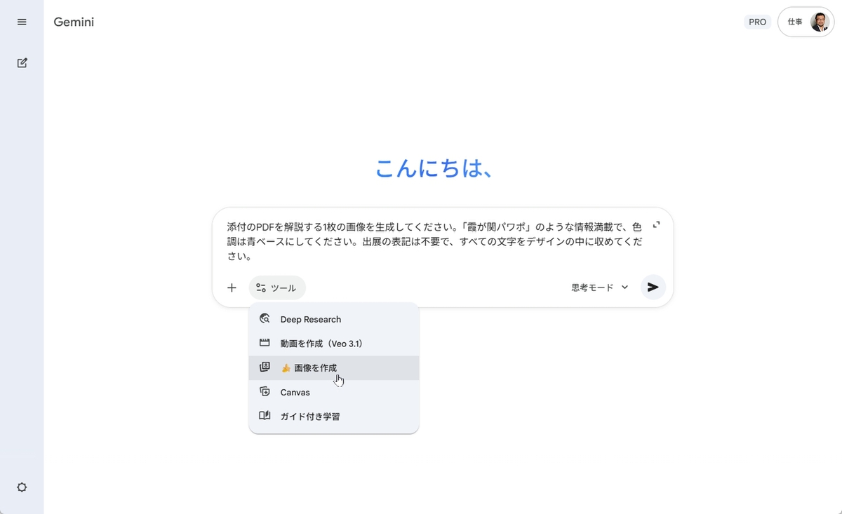 NanoBanana ProはGeminiの「ツール」メニューで「画像を作成」を選び、AIモデルを「思考モード」にしておけば利用できる。