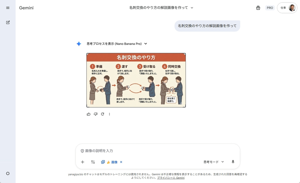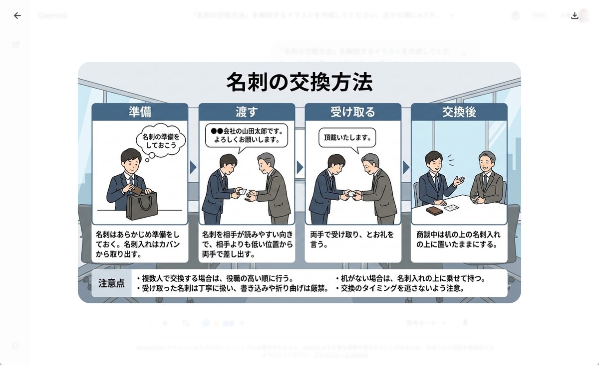続いて、社内研修などで重宝するイラストを生成してみよう。ここでは、名刺交換の基本を紹介する資料を作ってみる。まずは、「名刺交換のやり方の解説画像を作って」と適当に指示して作成させたところ、一見いい感じの4ステップの解説画像が生成された。しかし、「2:渡す」と「3:受け取る」の次に、「4:同時交換」となっており、ちょっと変。そんな時は、きちんと細かいところまで指示してあげよう。