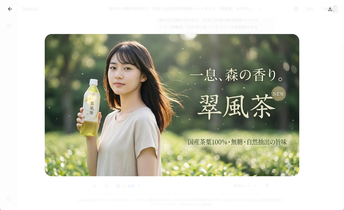 あらかじめペットボトルのお茶の新製品の画像と詳細をChatGPTで作成しておき、その広告ビジュアルを作ってもらった。望む画像の内容を列挙すればいい。箇条書きでもOKだ。今回は、Geminiにも手伝ってもらって、これでもかと要望を詰め込んでみた。