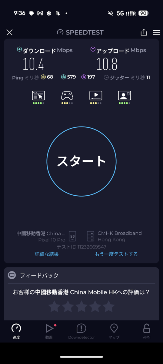 現地に到着してeSIMを有効化し、データローミングもオンにすると、問題なくインターネットへ接続できました。速度計測をしてみると、下り10.4Mbps・上り10.8Mbpsという結果に。当初10Mbpsに速度制限をされていることに気がつかなくて「5Gでつながっているわりには遅いな」と思っていましたが、ほぼスペックどおりにでていますね。