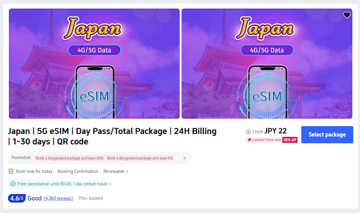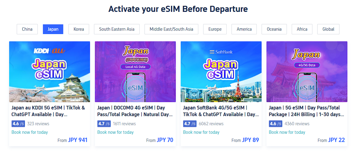 というわけで、激安ながらもしっかりと使えることがわかったTrip.comのeSIMサービス。海外旅行時の通信費をかなり抑えられるのでオススメです。ちなみにTrip.comの言語を日本語以外に変えると、日本向けのeSIMプランも表示されます。